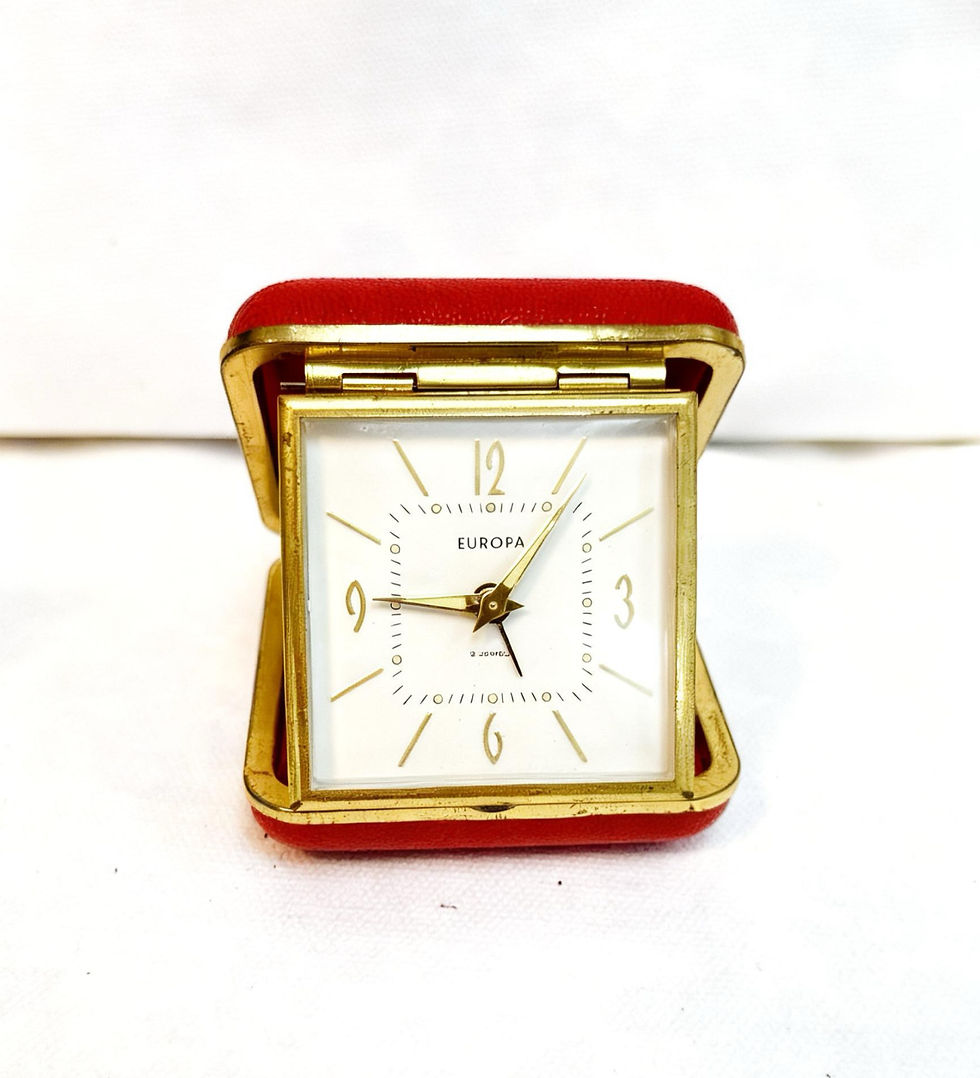 Klassische Reiseuhr im roten Leder-Etui – Goldener Rahmen – Vintage-Chic