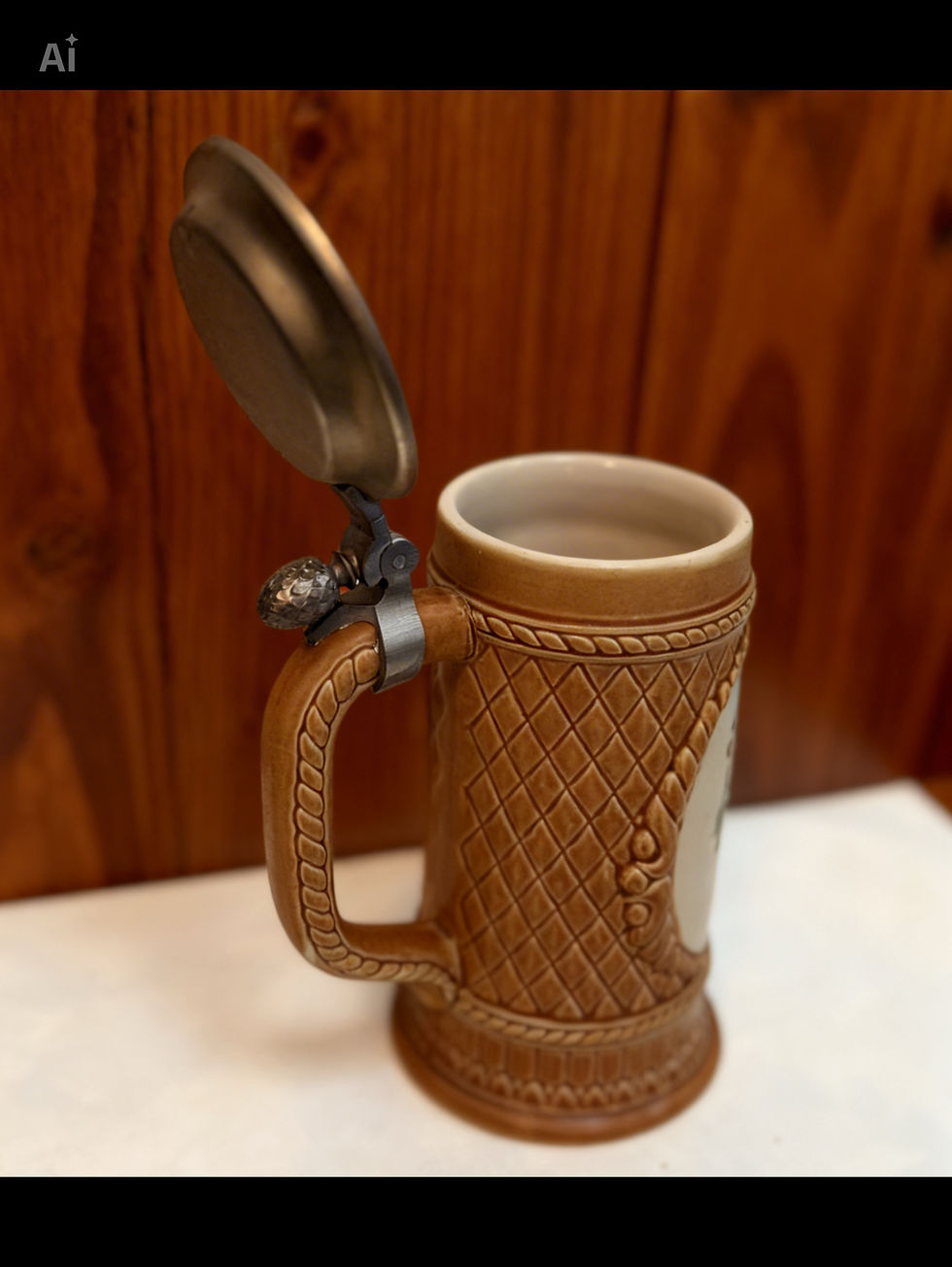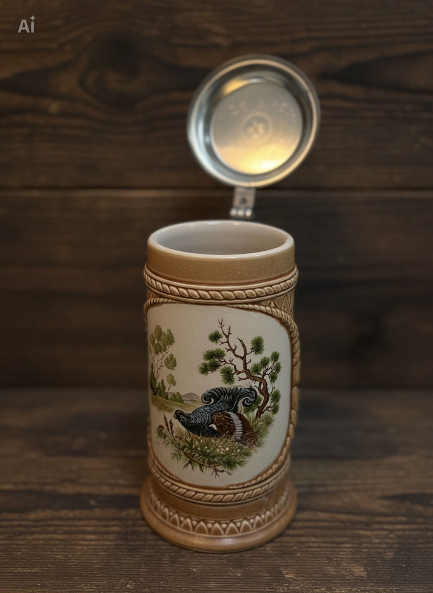 Rustikaler Keramik-Bierkrug mit Zinndeckel – Relief-Optik – Vintage Sammlerstück